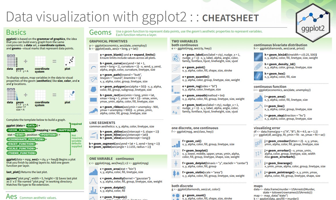 Aesthetic mappings (aes) - describes which variables are mapped to the x, y axes, alpha (transparency) and other visual aesthetics.