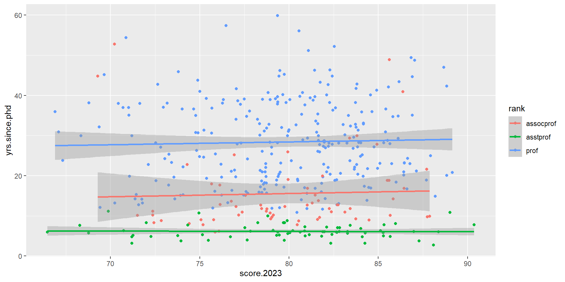 facet_wrap( ~ rank)yrs.since.phd with score.2023. Is there a trend or relationship there and does the trend differ between different rank?salary across different sex with a violin plot.Make sure to give the graph proper title and labels on both axis!