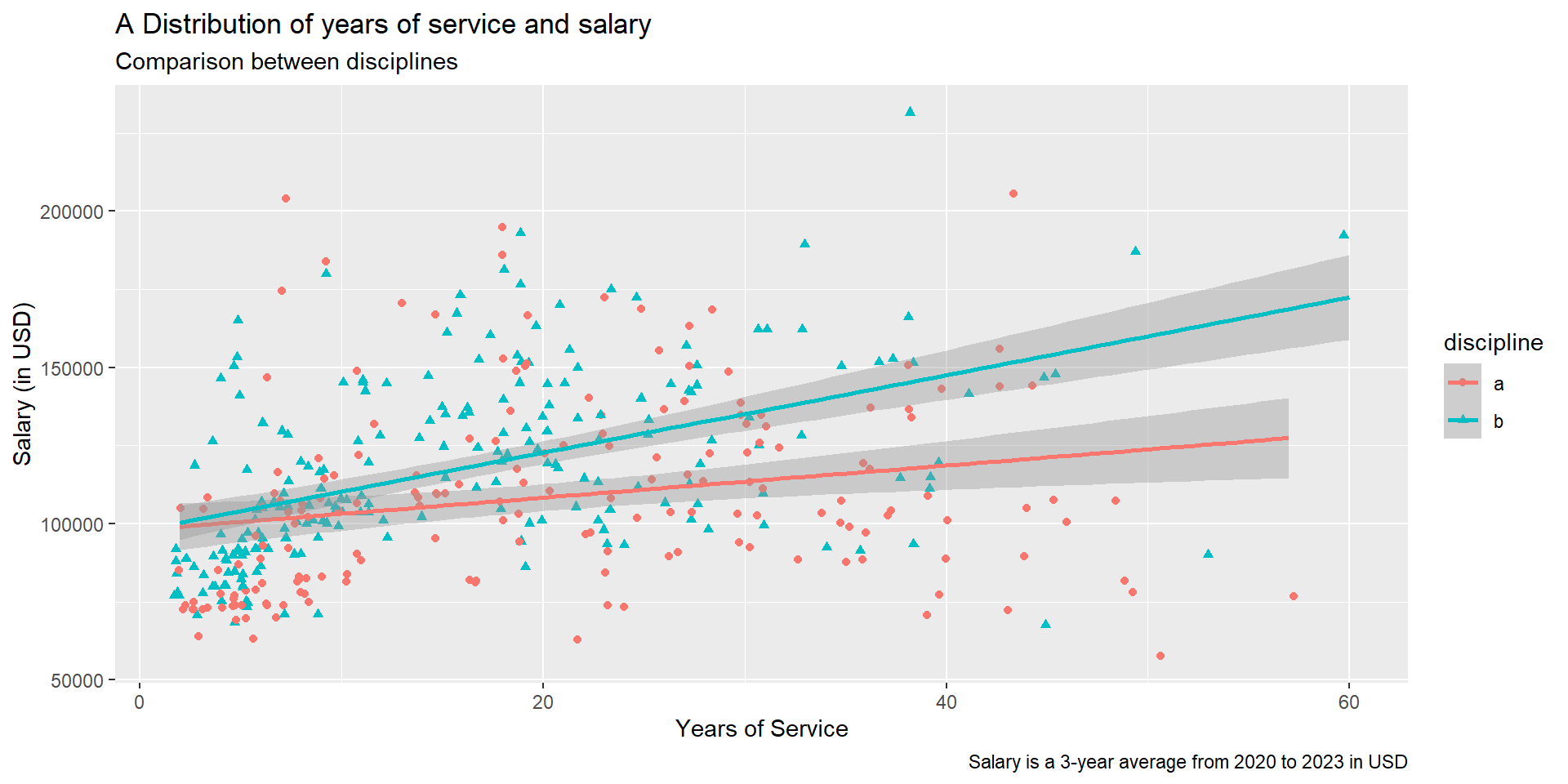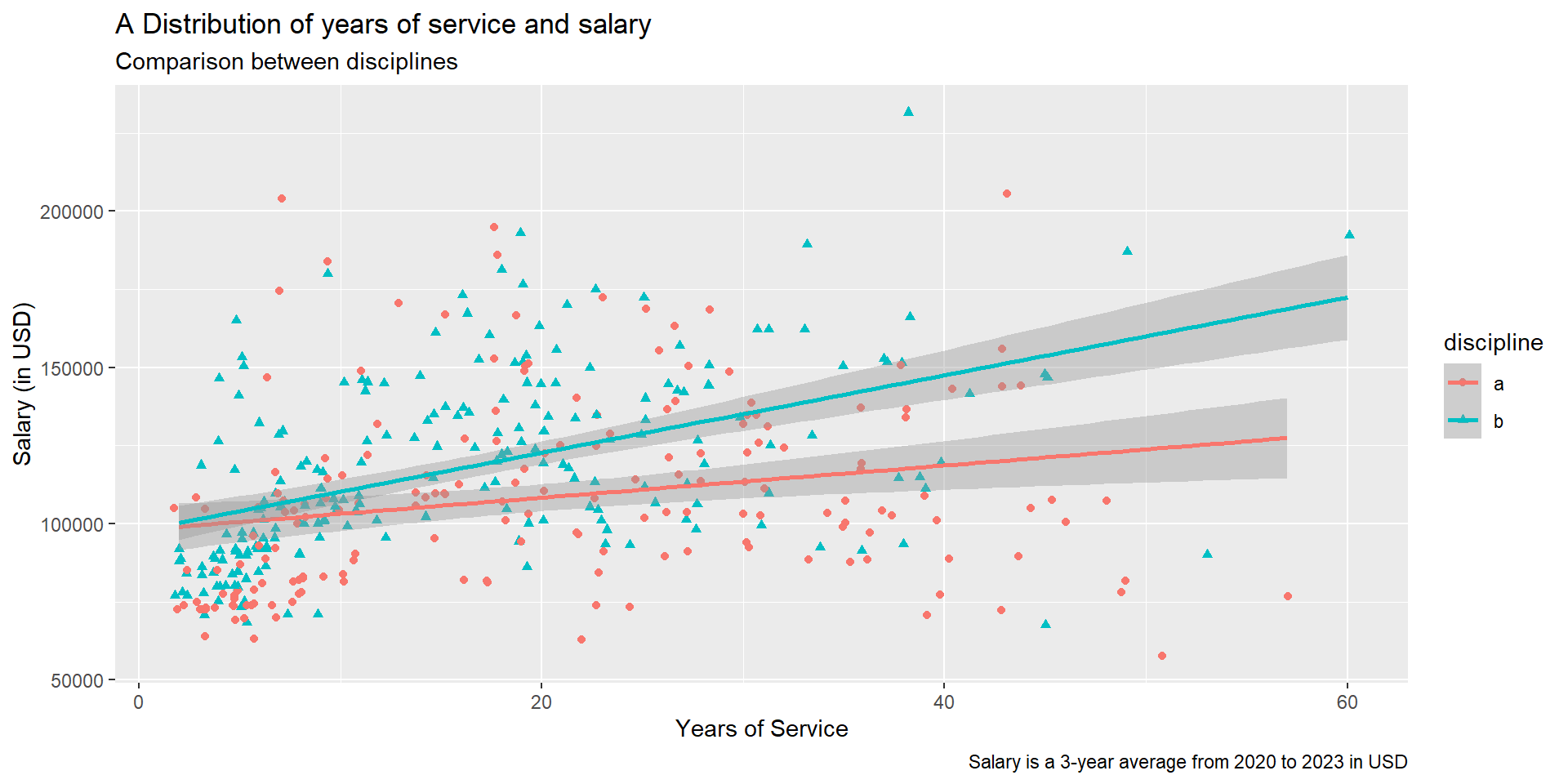 Visualize and explore the distribution of yrs.service and salary. Do you see any trend or differences between discipline? Don’t forget to label the graph!